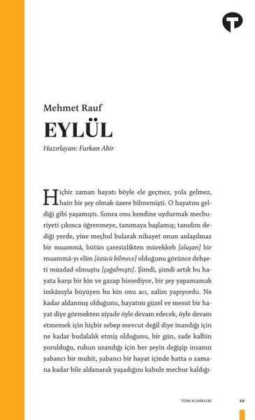 Türk edebiyatının ilk psikolojik romanı Eylül, evli bir kadın olan Suat'la Necip'in imkânsız aşkını konu edinir. Servet-i Fünun'un önde gelen yazarlarından Mehmet Rauf, mekânları ve mevsimleri de birer karaktere dönüştürüyor ve okuru sevgi sadakat, insan doğa, kadın erkek ilişkilerine dair sorular sormaya davet ediyor.